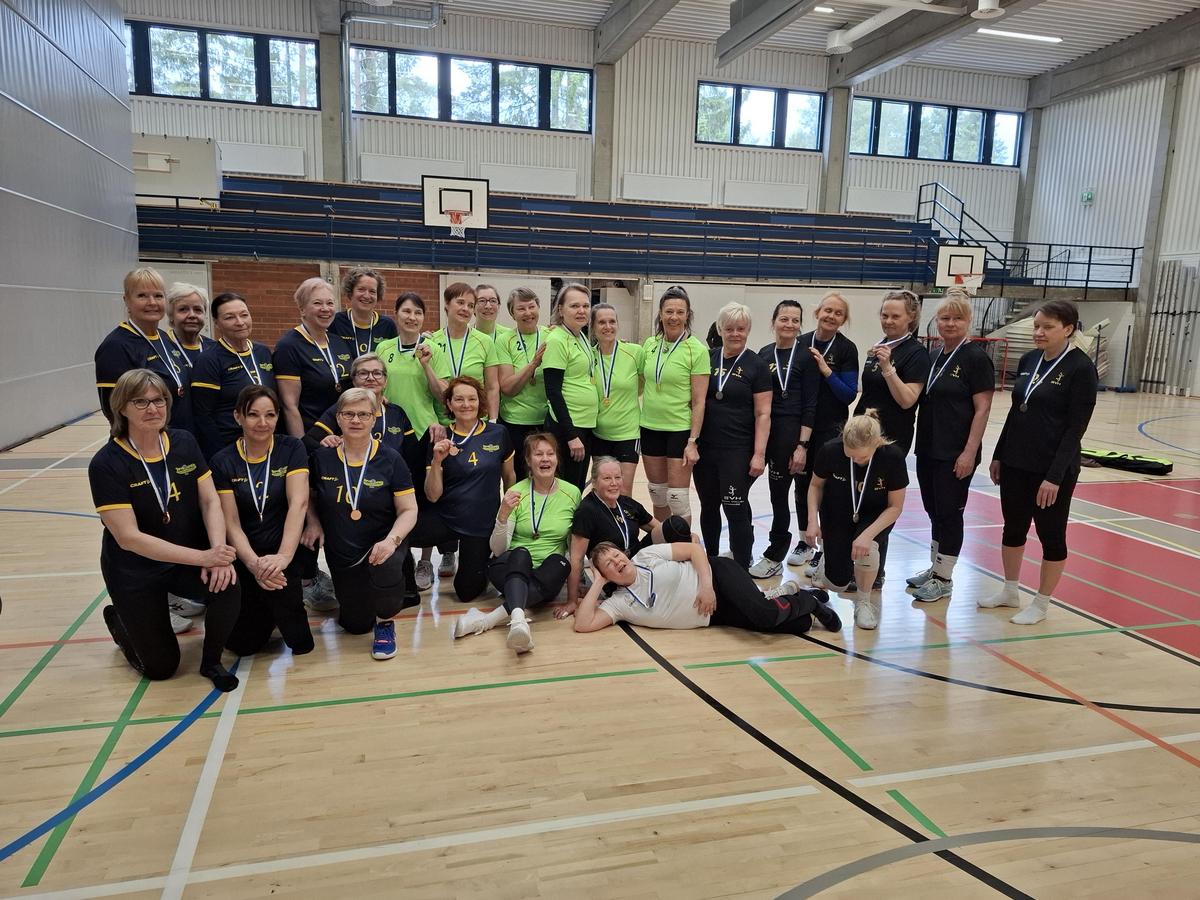 Naiset 60 SM-turnaus Oulussa 25.4.2026. Mitallijoukkueet yhteiskuvassa. Vasemmalla Terva-Lentis pronssia, keskellä Varkauden NMKY kultaa ja oikealla BVH Hyvinkää hopeaa.